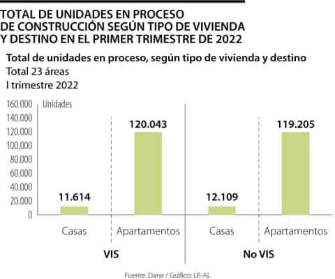 El Departamento Nacional de Estadística, (Dane) reveló que en el primer trimestre del año se registraron 262.971 unidades de vivienda en proceso de construcción, de las cuales 131.657 unidades (50.06%) representan viviendas de interés social, mientras que 131.314 unidades (49.94%) son viviendas diferentes a interés social.