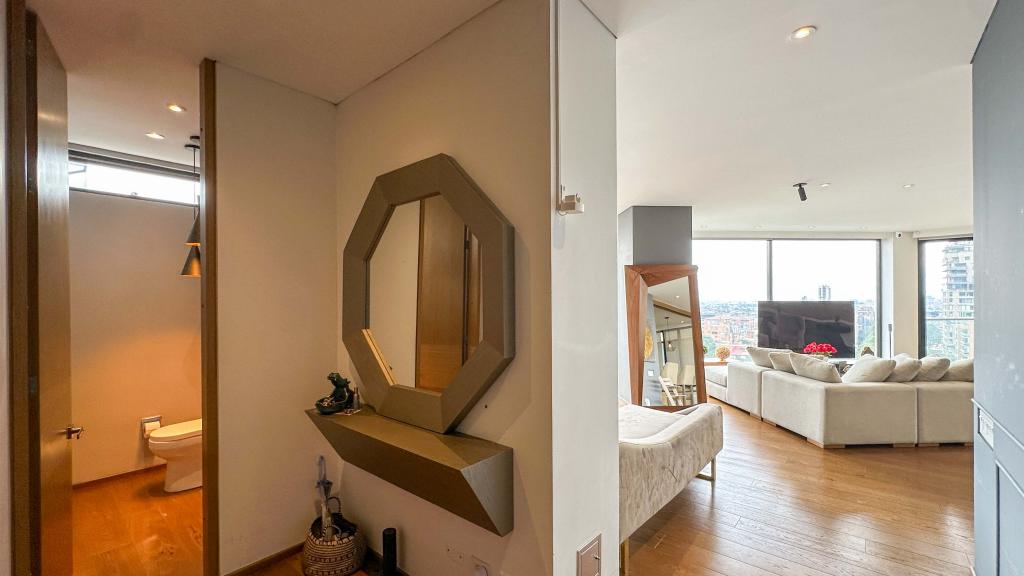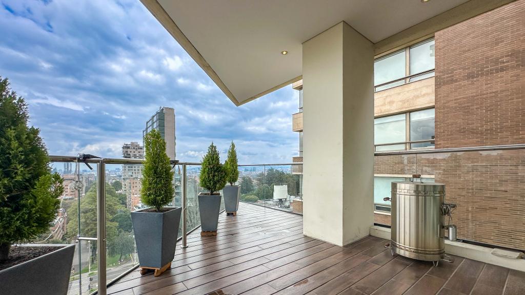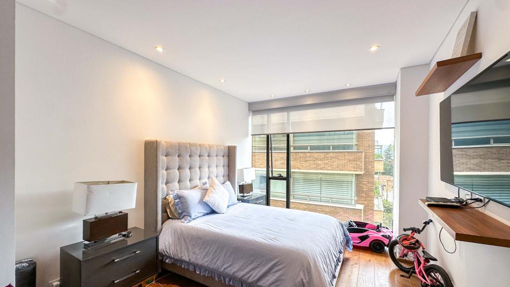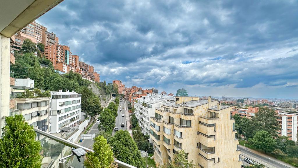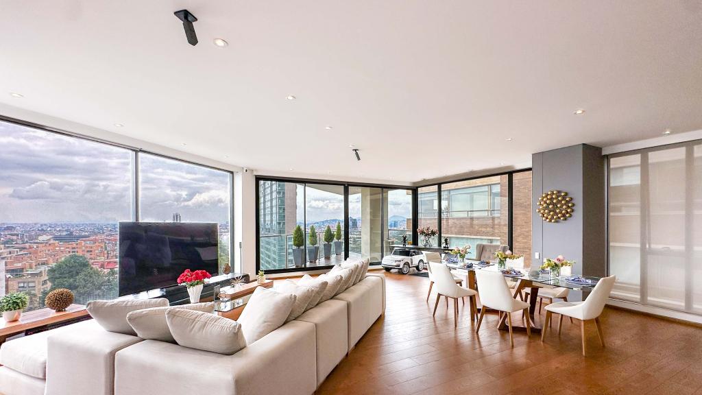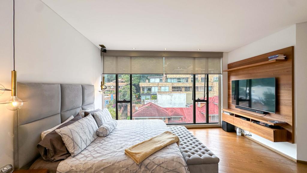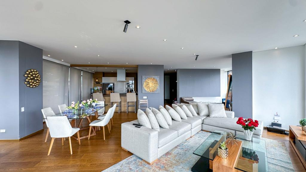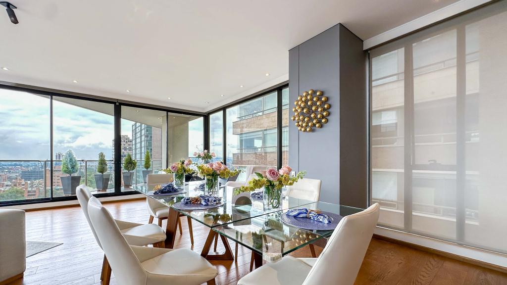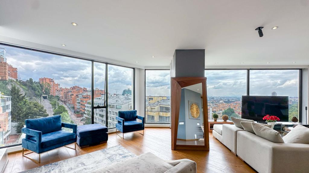 Al ingreso del apartamento, nos recibe una amplia zona social con techos altos y pisos en madera, que le dan calidez y carácter al espacio. La sala con chimenea y el comedor, se integran armónicamente, permitiendo disfrutar de un ambiente abierto, iluminado y acogedor. Balcón con vista panorámica de Bogotá. Cocina abierta que pero puede independizarse según la necesidad. Cuenta con tres habitaciones, cada una con baño. Sala de TV y baño social Complementan este apartamento cuarto, baño de servicio y dos ascensores que llegan al mismo. Piscina, gimnasio, sauna, planta eléctrica de suplencia total y siete parqueaderos.